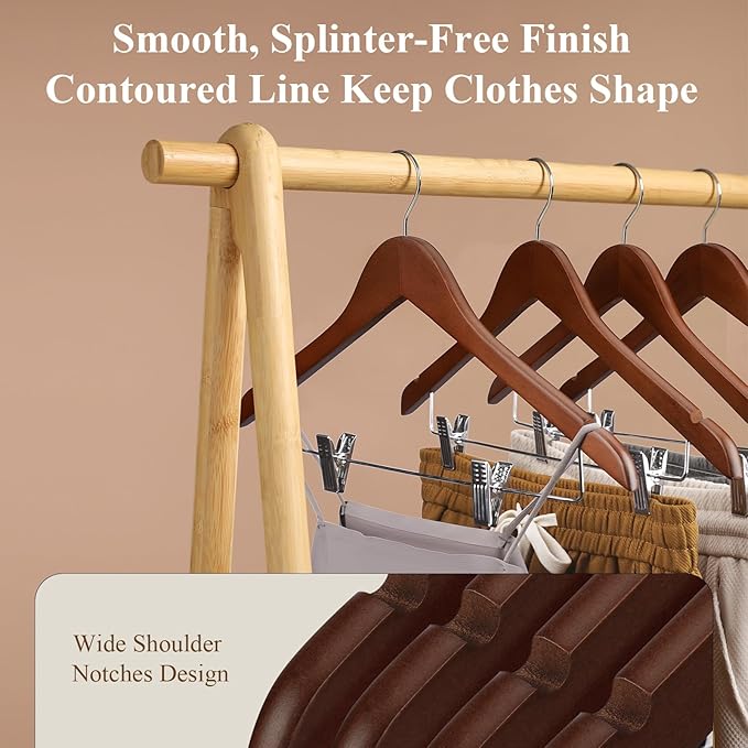 - 【2 In 1 For Suit Set】These hangers with clips are perfect for hanging pants, skirts, jeans and shorts.The shoulder contours of the wooden hanger mimic human shoulders,keeping your suit in nice shape.2 Piece Outfits on 1 hanger makes matching clothes more easily and create more space for your closet.