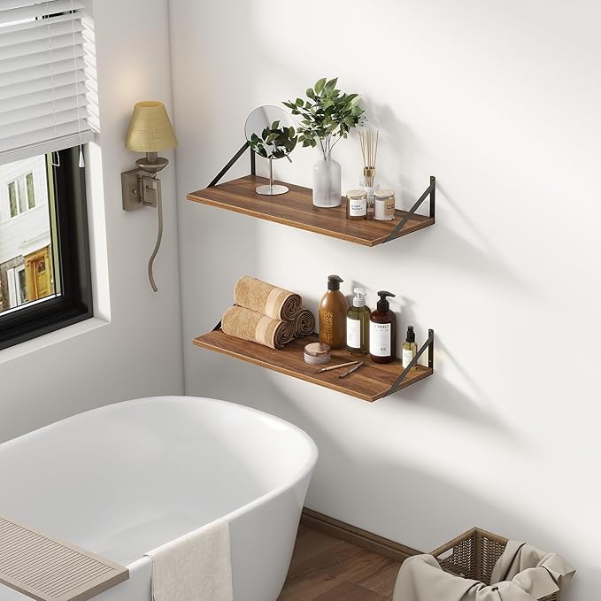 - 【FARMHOUSE RUSTIC WALL SHELF】These floating shelves are made of premium engineered wood board and visible triangular bracket. The rustic wooden grain surface add character and warmth to any modern or traditional interior with these deep floating shelves, contrast shelves at staggering heights on the wall or mount side-by-side or in the corner for a clean streamlined look.