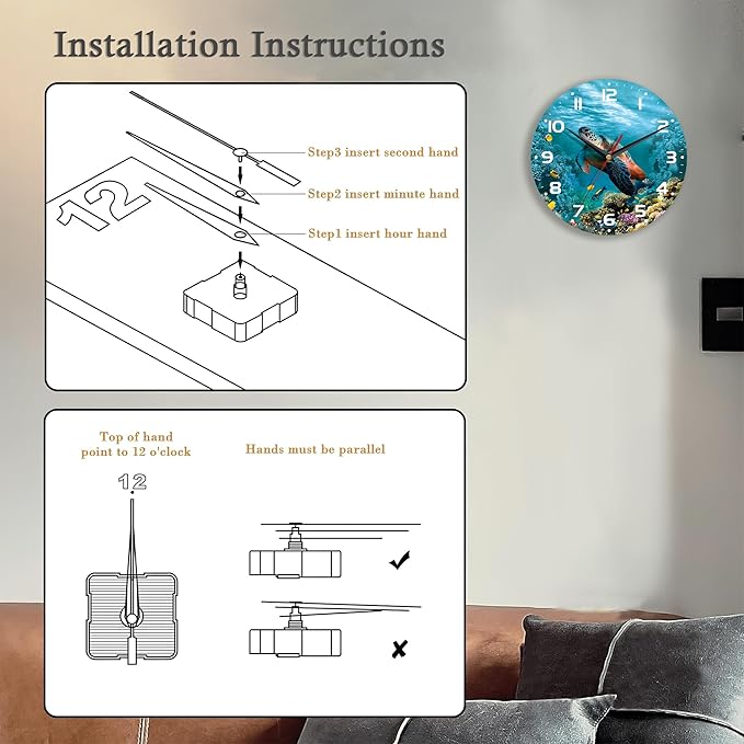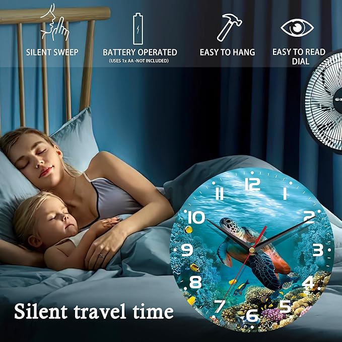 - 【Decorative Wall Clock】Sea Turtle Ocean Animals Prints Are Bright And Colorfast, Metal Hands, Colorful And Easy To Read,Back Slot Design Is Easy To Install, Comes With 1 Hook, Also Comes With a Stand, You Can Put The Wall Clock On The Table For Easy Viewing.