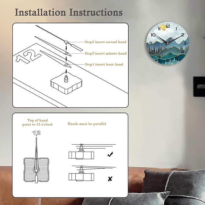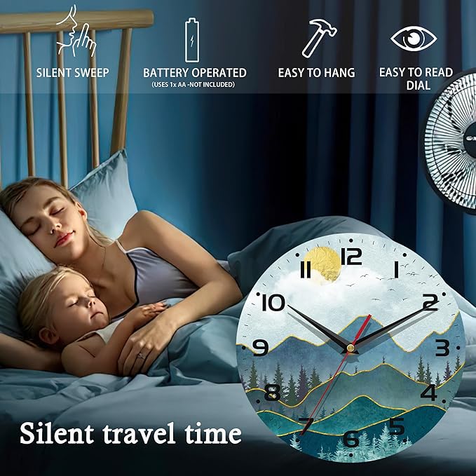 - 【Decorative Wall Clock】Abstract Mountain Sun Prints Are Bright And Colorfast, Metal Hands, Colorful And Easy To Read,Back Slot Design Is Easy To Install, Comes With 1 Hook, Also Comes With a Stand, You Can Put The Wall Clock On The Table For Easy Viewing.