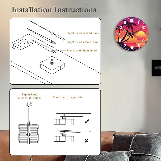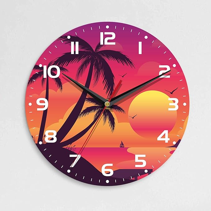 - 【Decorative Wall Clock】Tropical Palm Sunset Prints Are Bright And Colorfast, Metal Hands, Colorful And Easy To Read,Back Slot Design Is Easy To Install, Comes With 1 Hook, Also Comes With a Stand, You Can Put The Wall Clock On The Table For Easy Viewing.