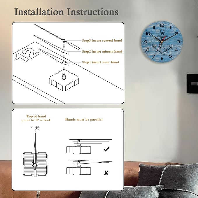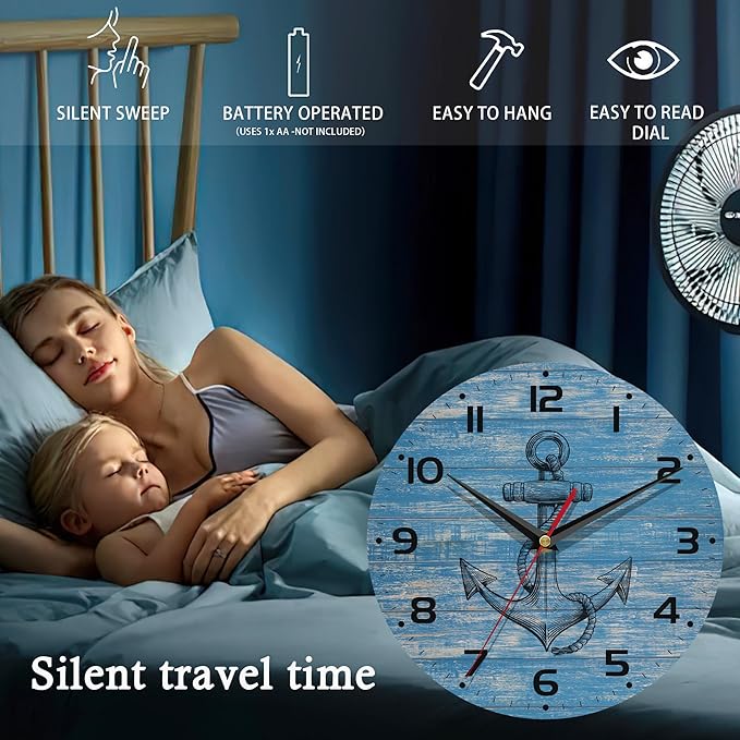 - 【Decorative Wall Clock】Vintage Blue Nautical Anchor Prints Are Bright And Colorfast, Metal Hands, Colorful And Easy To Read,Back Slot Design Is Easy To Install, Comes With 1 Hook, Also Comes With a Stand, You Can Put The Wall Clock On The Table For Easy Viewing.