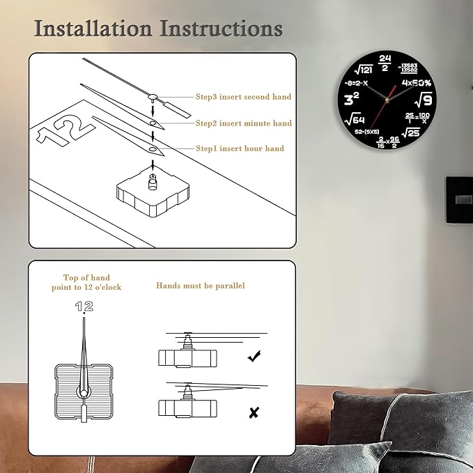 - 【Decorative Wall Clock】Simple Math Formula Markers Prints Are Bright And Colorfast, Metal Hands, Colorful And Easy To Read,Back Slot Design Is Easy To Install, Comes With 1 Hook, Also Comes With a Stand, You Can Put The Wall Clock On The Table For Easy Viewing.