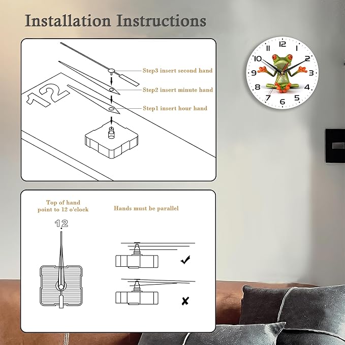 - 【Decorative Wall Clock】Funny Frogs Prints Are Bright And Colorfast, Metal Hands, Colorful And Easy To Read,Back Slot Design Is Easy To Install, Comes With 1 Hook, Also Comes With a Stand, You Can Put The Wall Clock On The Table For Easy Viewing.