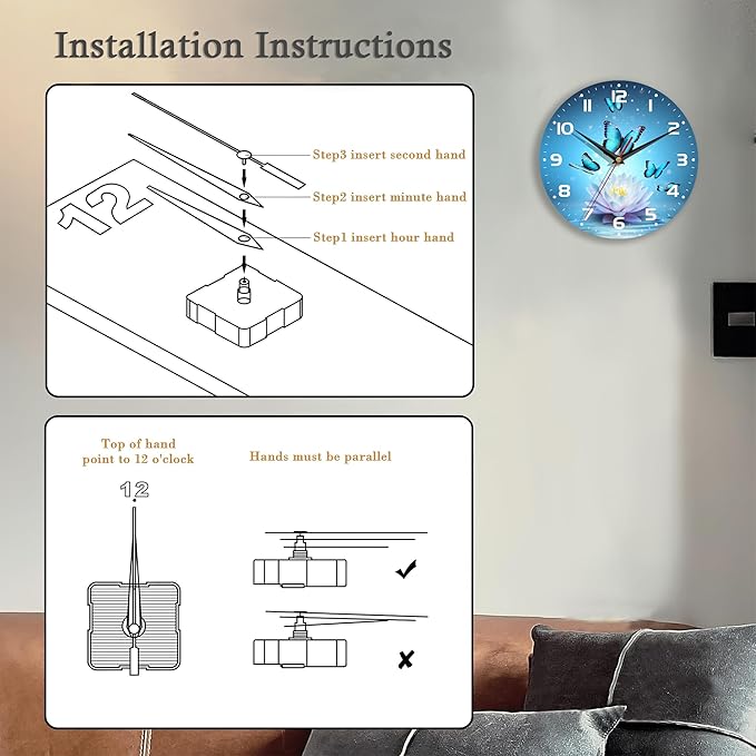 - 【Decorative Wall Clock】Magic Lotus Flower Butterfly Prints Are Bright And Colorfast, Metal Hands, Colorful And Easy To Read,Back Slot Design Is Easy To Install, Comes With 1 Hook, Also Comes With a Stand, You Can Put The Wall Clock On The Table For Easy Viewing.