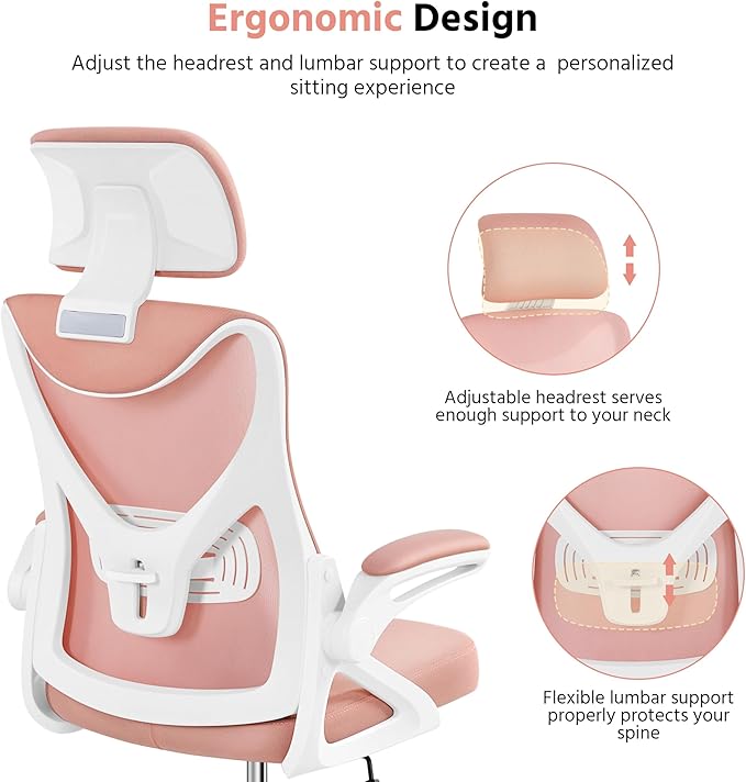 Yaheetech Ergonomic Office Chair, High Back Mesh Desk Chair with flip-up Armrests, Adjustable Headrest Computer Chair with Lumbar Support for Home Oiffce Gaming Room, White/Pink