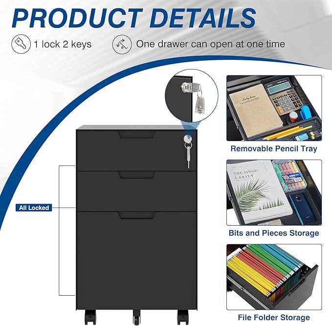 - CAN BE PLACED EVERYWHERE - Thanks to the compact design and five flexible wheels of this filing cabinet, you can easily putting it under the desk, next to the sofa, in the bedroom to using as a under desk file cabinet, a bedside tables etc.