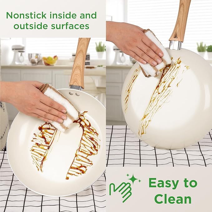 - Easy to Clean: Ceramic cookware set requires less oil to cook, preventing food from sticking simply wipe with a paper towel or rinse with water to save time and water, making cooking at home healthier and easier
