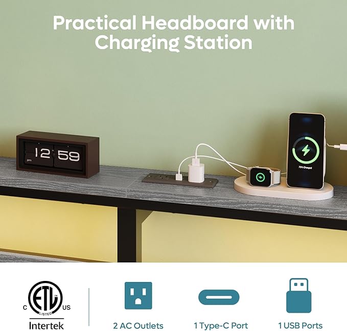 - 【Convenient Charging Station & LED Light】 The queen bed frame with headboard features 1 Type-C, 1 USB A port, and 2 AC outlets to keep your devices powered and within easy reach. Use the remote, app or wire control to select from 22 dynamic modes and 7 colors to match your mood.