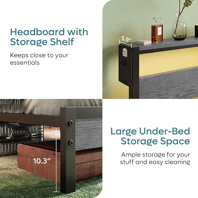 - 【Headboard Storage Shelf & Under-Bed Storage】 The LED Platform Bed Frame offer a convenient storage solution, keeping essentials within easy reach and providing an additional space for decorating your home. The 10.3-inch under-bed space is perfect for storing luggage and easy to clean.