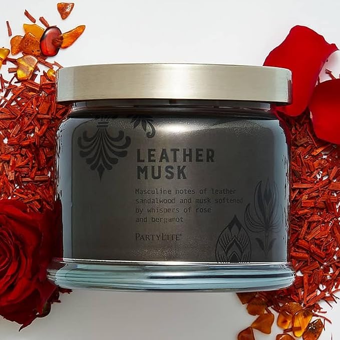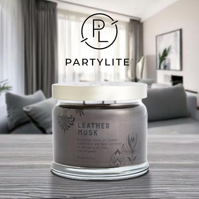 PartyLite 3-Wick Jar Candle, Highly Fragranced Clean Burning Glass Candle, 25-45 Hours Burn Time (Leather Musk)