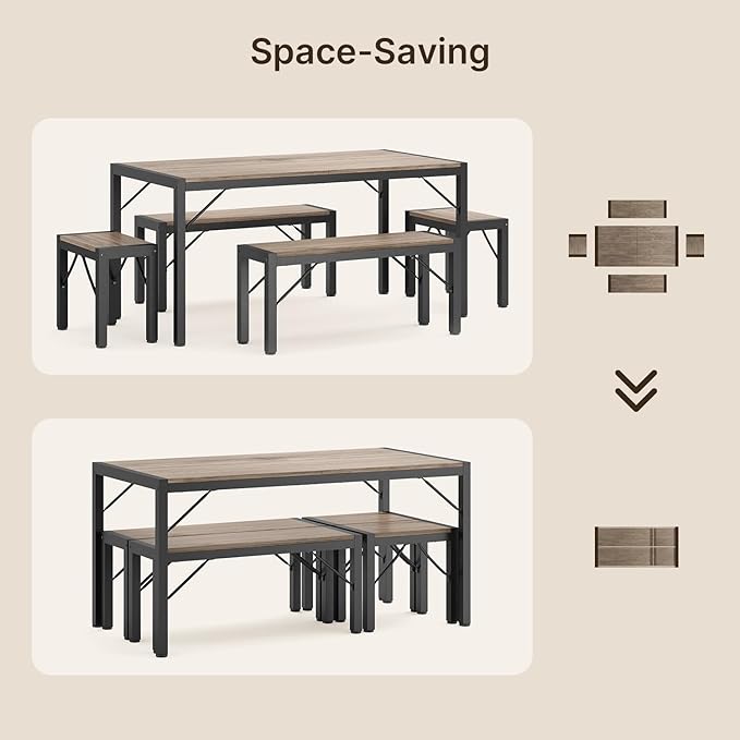 Gizoon 63" Dining Room Table Set for 6, Kitchen Table with 2 Benches and 2 Stools, Dining Table Set with Metal Frame, Space-Saving Kitchen Table Set for Apartment, Grey