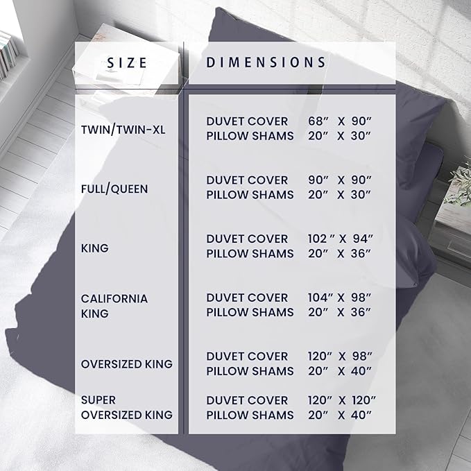 - CALIFORNIA KING SIZE DUVET COVER – LUXURY HOTEL QUALITY: Includes 1 California King Duvet Cover (104" x 98") and 2 Pillow Shams (20" x 36") for a perfect fit. Comforter not included. Please measure your insert before purchasing.
