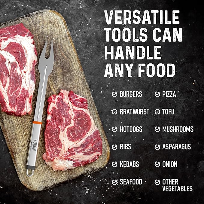 - Elevate your BBQ game with this go-to BBQ tool set. This complete grill tool kit includes a spatula, tongs, fork, and brush. The spatula is perfect for flipping burgers, onions, and other veggies, while the tongs keep your hands safe from the heat as you handle steaks and bratwursts. Use the long-handled fork to turn and manage large cuts of meat like sausages, roasts, or kebabs. The brush is ideal for slathering on your favorite BBQ sauces, giving your food that perfect finishing touch.