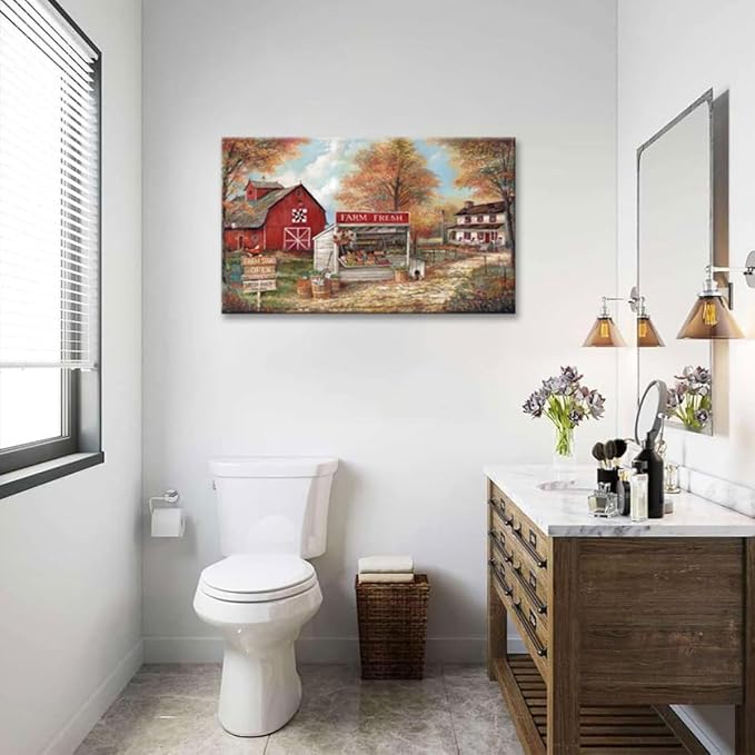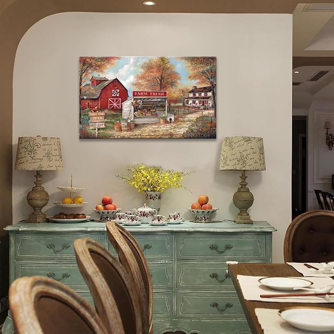 CYULWNNO Farmhouse Canvas Wall Art Farm Stand Landscape Painting Nature Rustic Scenery Canvas Prints Vintage Red House Wall Decor Framed for Living Room Bedroom