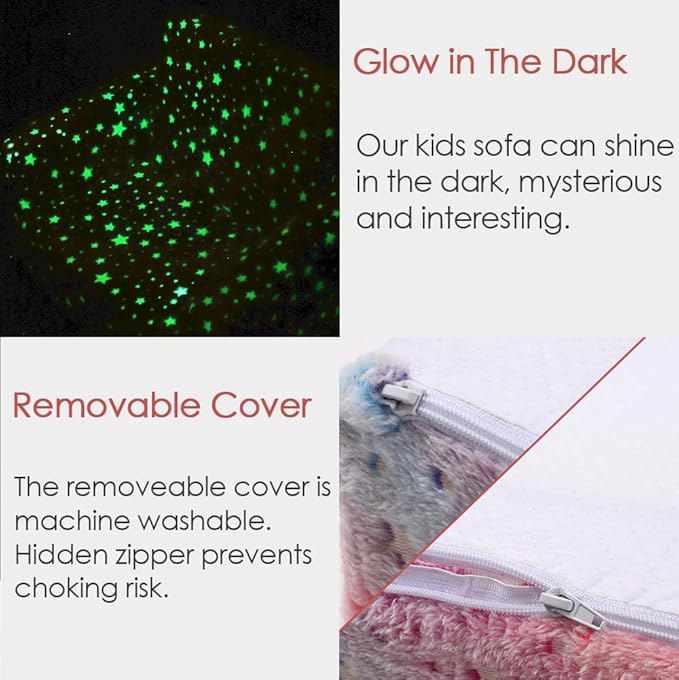 - šćGlow-in-the-Darkć Our kids sofa can shine in the dark, mysterious and interesting. Just expose it to a bright light source or sunlight for about 15 to 20 minutes. The brighter the light, the stronger the sofa will be in the dark. Create a beautiful atmosphere for your bedroom and watch the magic happen