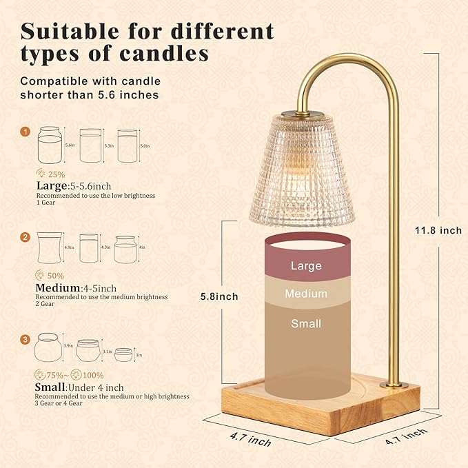- 【Dimmable Candle Warming Lamp for Different Candles】The distance from the base of this candle heat lamp to the lampshade is 5.8 inches, which is compatible with a wide range of jar candles of different heights. Made of high quality wood base, the non-slip pad under the base ensures the stability of the base, making you feel more secure when using this candle warmer with timer.