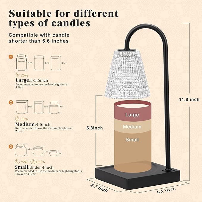 - 【Dimmable Candle Warming Lamp for Different Candles】The distance from the base of this candle heat lamp to the lampshade is 5.8 inches, which is compatible with a wide range of jar candles of different heights. Made of high quality wood base, the non-slip pad under the base ensures the stability of the base, making you feel more secure when using this candle warmer with timer.