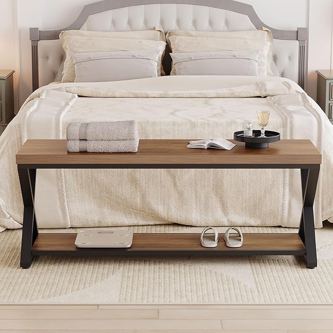 - Durable Construction: Built with a powder-coated X-shaped metal frame and high-quality MDF, the sturdy design ensures outstanding stability for long-lasting use. The narrow wooden bench can support up to 360 lbs on the top shelf.