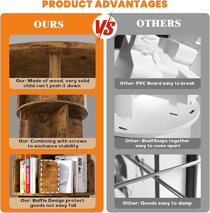 - 【Pretty stable 360° Spinning Bookcase】The Narrow Book Storage Shelf is made of high-quality E1 MDF Board, matel screws reinforcement, excellent stability and durability. It is very stable once assembled, won't have any tilt or shaking during the entire rotation process of the bookshelf.