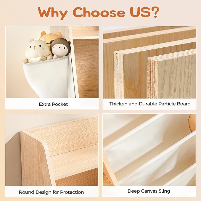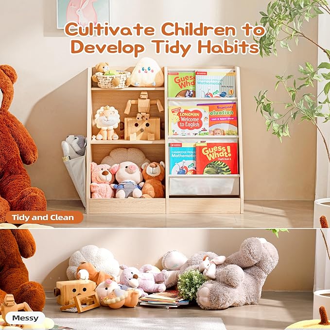 - Large Storage Space: With its three-tier wooden book rack and three deep storage sling pockets, this organizer provides endless organizational possibilities. This bookcase is perfect for storing reading books, coloring books, comic books, picture books, and toys, making it easy for little ones to identify their favorites.