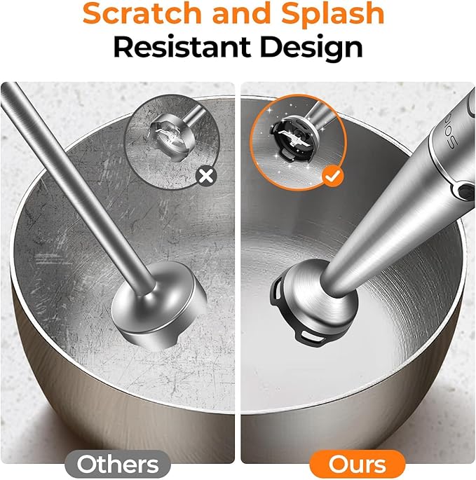 - Scratch and Splatter Free with Pot Protector:The food-grade nylon blade guard protects cookware from scratches. You don't have to worry about scratches on your favorite cookware while using the hand blender. The unique splash guard prevents spills and keeps your clothes and kitchen clean for hassle-free clean up.