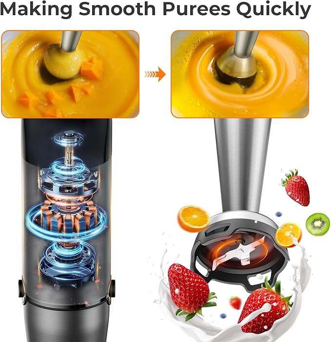 - Powerful Motor and Upgraded Blades:The 1100W all-copper motor delivers strong power to the 5-in-1 immersion blender. It can dramatically increase the mixing and chopping ability in seconds, quickly process the ingredients finely and evenly, and effectively shorten your cooking time. Upgraded 304 food grade stainless steel blades with good resistance to oxidation and high temperature. Safe to use even in hot soups.