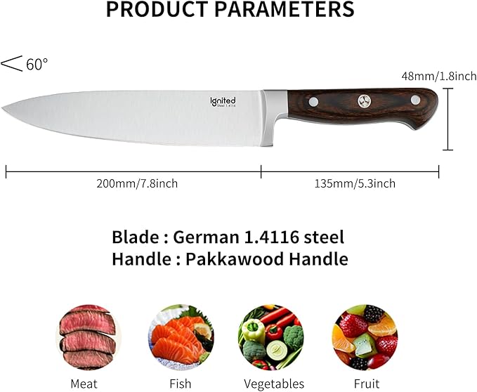 - Premium Quality: Crafted from 1.4116 German high carbon steel, this 8 inch chef knife offers exceptional durability and sharpness, making it a reliable tool for both professional chefs and home cooks alike