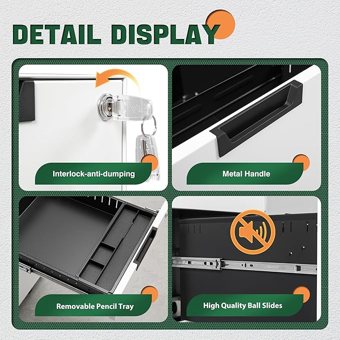 - Metal Material:File cabinet is made of 0.8mm thick steel,whole is solid and does not deform, and it is stronger than wooden filing cabinets in terms of firmness, durability, moisture resistance, and fire protection