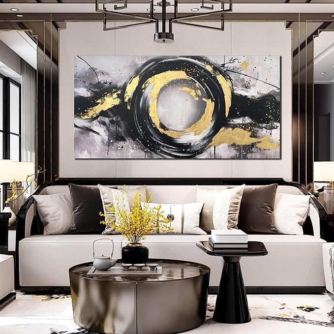 Black White and Gold Wall Art for Living Room Large Size - Hand Painted Wall Art for Bedroom - Abstract Painting Wall Decor Office Size 29" x 59"