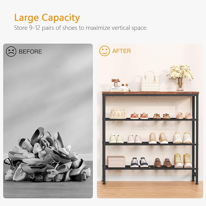 usikey 4-Tier Shoe Rack, Industrial Shoe Storage Organizer for 9-12 Pairs of Shoes, Metal Shoe Shelf with Wooden Top, Shoe Stand with 3 Metal Shelves for Entryway, Hallway, Closet, Rustic Brown