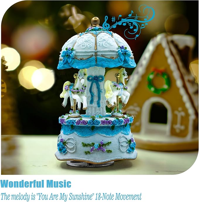 Carousel Music Box,Luxury Color Change LED Light Music Box,Luminous Rotating 3-Horse Musical Box with Gift Box for Girls Birthday Valentine Gift (You are My Sunshine, Blue)