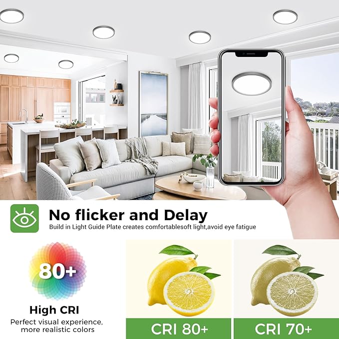 - 【Protect Your Eyes & Ensure Safety】Our flush-mount lights provide flicker-free and blue light-free lighting, prioritizing your eye health and comfort. Experience authentic and vibrant lighting with a high Color Rendering Index (CRI) of over 80. The fire-resistant plastic shell prevents electric shock, leakage, and potential disasters from short circuits. Rest assured with ETL and CE approval,ensuring the safety of your family