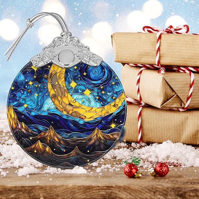 Retro Moon Star Stained Glass Hanging Ornament - Christmas Tree Decoration, Holiday Ornament, Gift Idea