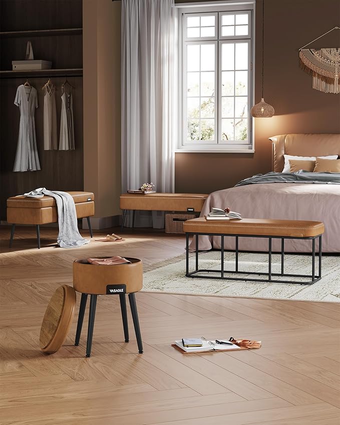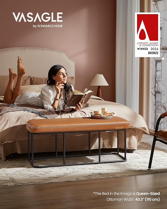 VASAGLE EKHO Collection - Storage Bench for Entryway, Ottoman Bench with Steel Frame, 43.3-Inch Wide, Synthetic Leather, Living Dining Room, Mid-Century Modern, Loads 660 lb, Caramel Brown ULOM085K01