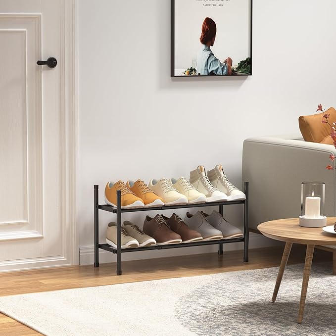Expandable Shoe Rack, 2 Tier Shoe Rack for Closet, Stackable Adjustable Standing Metal Shoe Shelf Organizer Storage, Small Shoe Racks for Front Door Entrance、Entryway(Black)