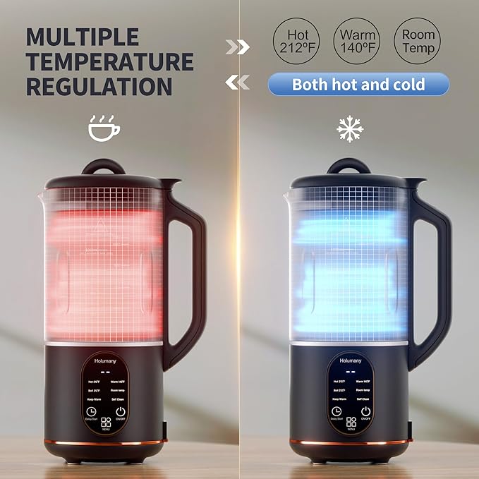 - EASY FOR HOMEMADE MILK - The Holumany Milk Maker simplifies the process by eliminating the steeping step. Experience a variety of features based on your preferences: Room Temp for plant-based milk and other beverages, Warm (140°F) for comfort beverages, and Hot (212°F) for soy milk and hot beverages. Boiling water for hot water, Keep Warm (up to 6 hours) and Delay Start (up to 18 hours) options add to the convenience. There's also an auto-clean feature that cleans in just 60 seconds!