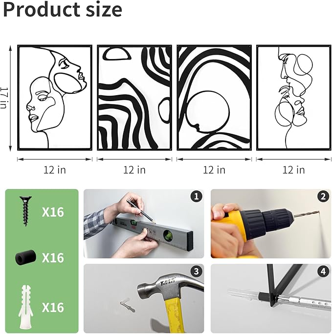 - Metal Wall Art Size : The minimalist metal wall art comes in a set of 4, each measuring 17 inches x 12 inches, making it a versatile size for various spaces. The set is securely packaged to ensure the pieces arrive in perfect condition, with smooth edges and a rust-proof finish.
