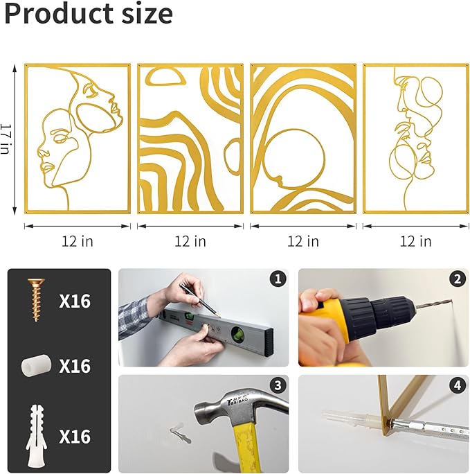 - Metal Wall Art Size : The minimalist metal wall art comes in a set of 4, each measuring 17 inches x 12 inches, making it a versatile size for various spaces. The set is securely packaged to ensure the pieces arrive in perfect condition, with smooth edges and a rust-proof finish