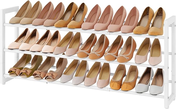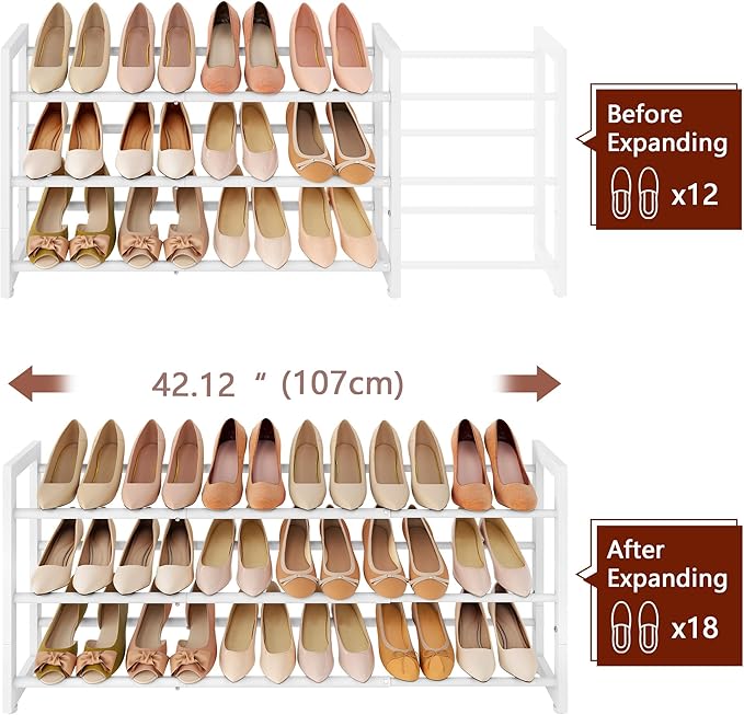 FAVOOSTY 3-Tier Expandable Shoe Rack, Adjustable Shoe Shelf Storage Organizer Space Saving Metal Free Standing Shoe Rack for Entryway Closet Doorway, White