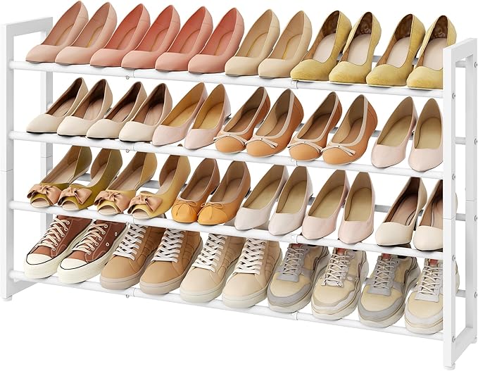 FAVOOSTY 4-Tier Expandable Shoe Rack, Adjustable Shoe Shelf Storage Organizer Space Saving Metal Free Standing Shoe Rack for Entryway Closet Doorway, White