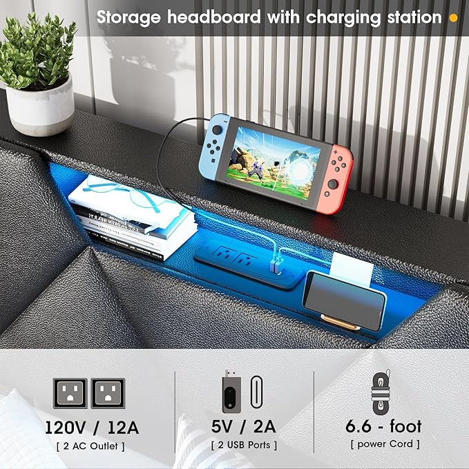 - Headboard with USB Power Strips:2 Usb And 2 Ac Power Strip Was Built Into The Headboard.Allowing You To Easily Charge Your Device While Sleeping. Keep Your Phone, Tablet, Or Other Electronic Device Within Reach And Fully Charge It.