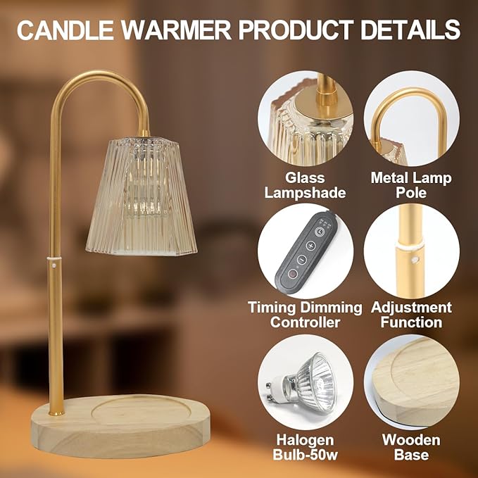 LIDORE Candle Warmer, Candle Warmer Lamp with Timer, Wooden Base Golden Glass, Gift for Mothers Day Valentines Day Christmas New Year, Home Decor, with 2 GU10 Bulbs