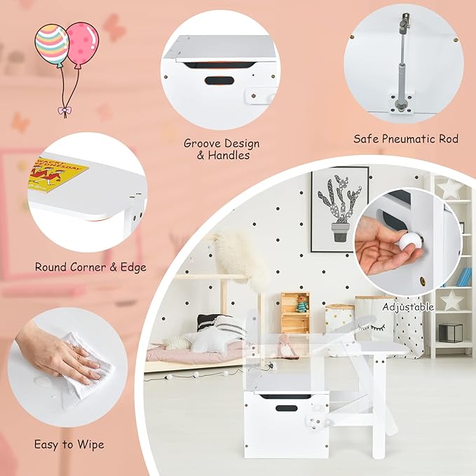 - 【Premium Wooden Material】This kids table and chair set is made of sturdy wooden material with table top maximum weight capacity up to 22 lbs and chair maximum weight capacity up to 66 lbs. And round polished corner effectively protects kids from hurt and built-in pneumatic rod is designed for convenient open and close.