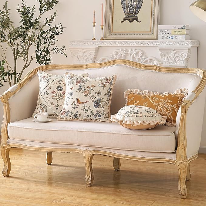 Design Square Floral Bird Linen Throw Pillow Covers 18"x18" Pack of 2, Yellow Pink Cushion Covers with Flower Chinese Hwamei Decor Pillowcases for Bed,Living Room,Outdoor,Car