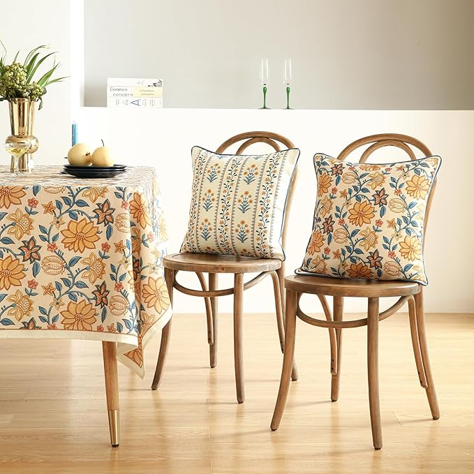 Design Square Simple Elegant Linen Throw Pillow Covers 18"x18" Pack of 2, Blue Yellow Floral Pattern Cushion Covers Decor Pillowcases for Bed,Living Room,Outdoor,Car