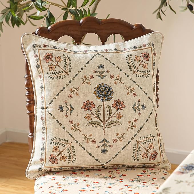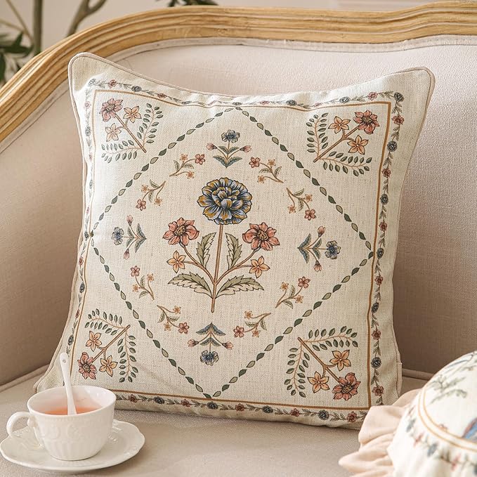Design Square Floral Linen Throw Pillow Covers 18"x18" Pack of 2, Yellow Pink Flower Pattern Cushion Covers Decor Pillowcases for Bed,Living Room,Outdoor,Car