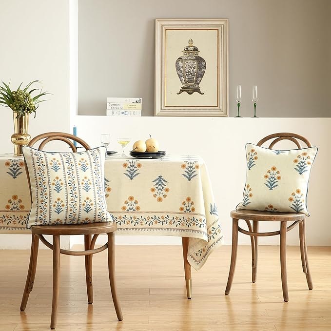 Design Square Simple Elegant Linen Throw Pillow Covers 18"x18" Pack of 2, Blue Yellow Floral Pattern Cushion Covers Decor Pillowcases for Bed,Living Room,Outdoor,Car