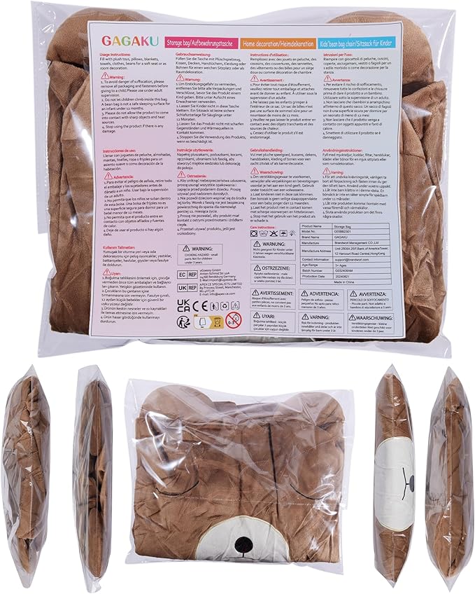 GAGAKU Stuffed Animal Bean Bag Cover Toy Storage, 24 Inches Kids BeanBag Brown Bear Large Zipper Bean Bag for Organizing Kids Plush Toys Home Supplies