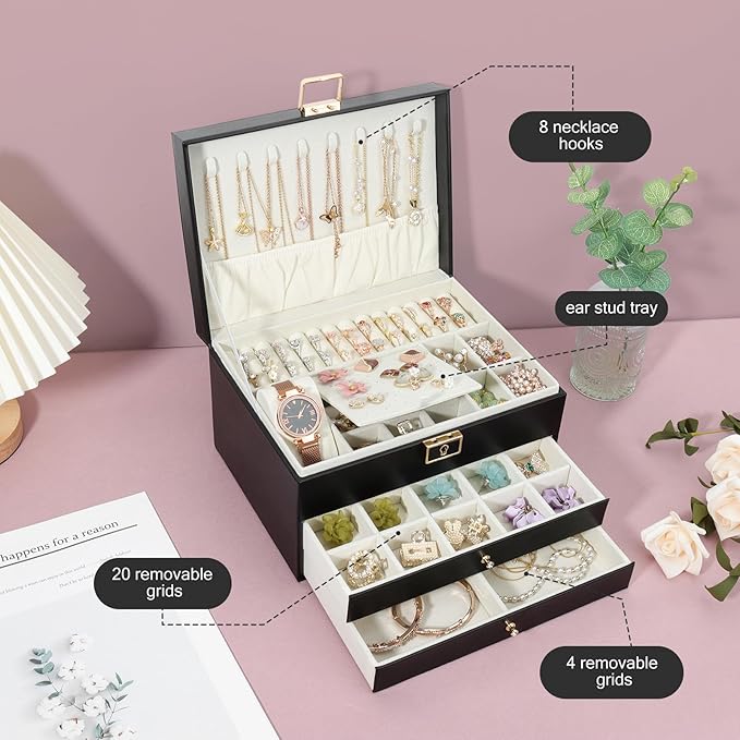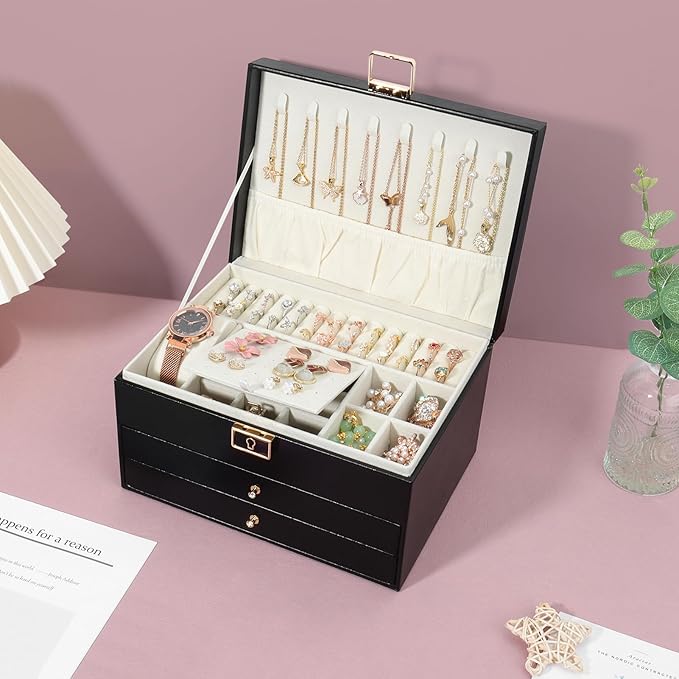 DesignSter Jewelry Box,Jewelry Organizer with 2 Drawers, 3 Layers Leather Jewelry Storage Box with Lock, Jewelry Storage Case for Necklaces Earrings Bracelets and Rings(Black)